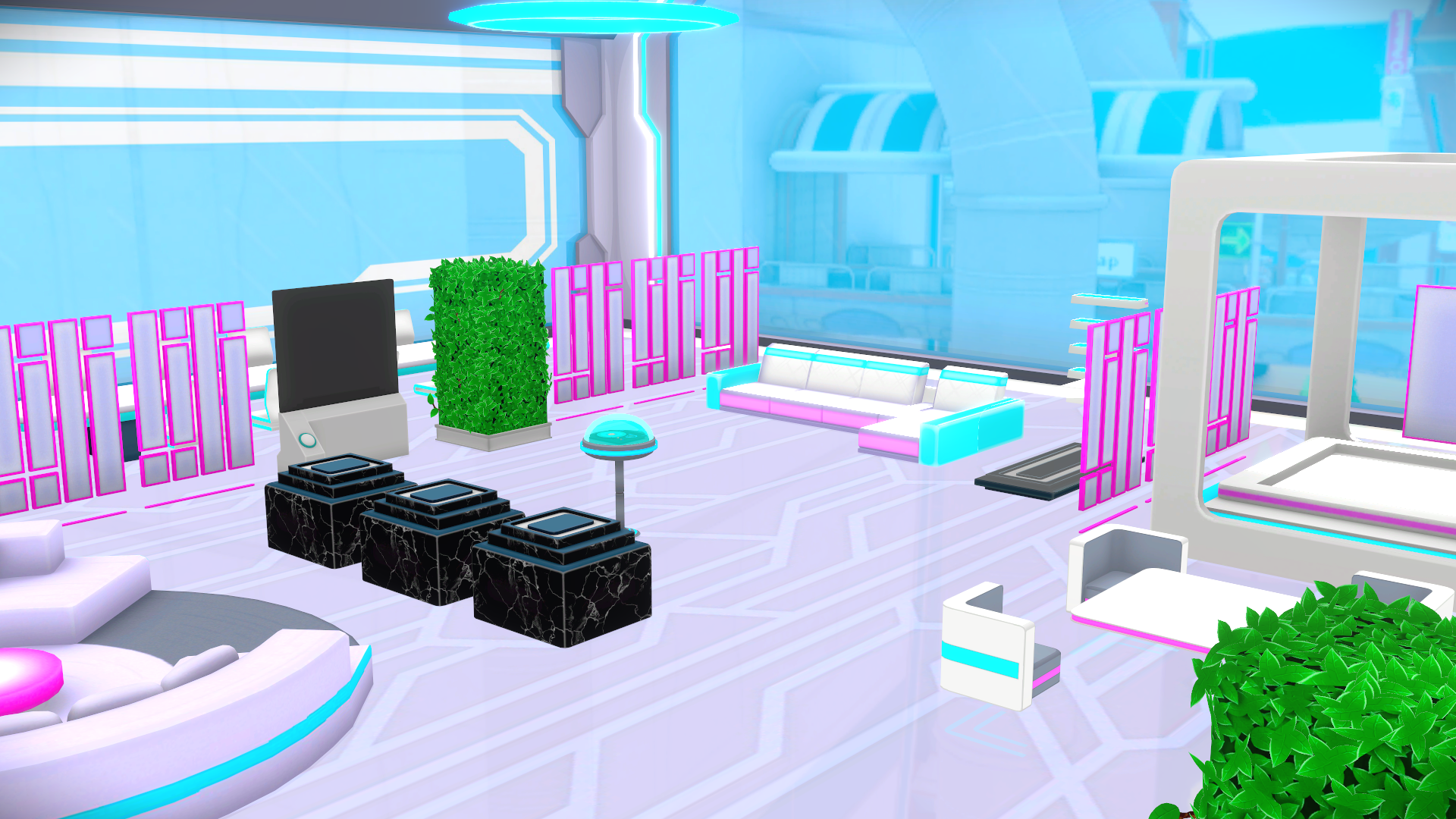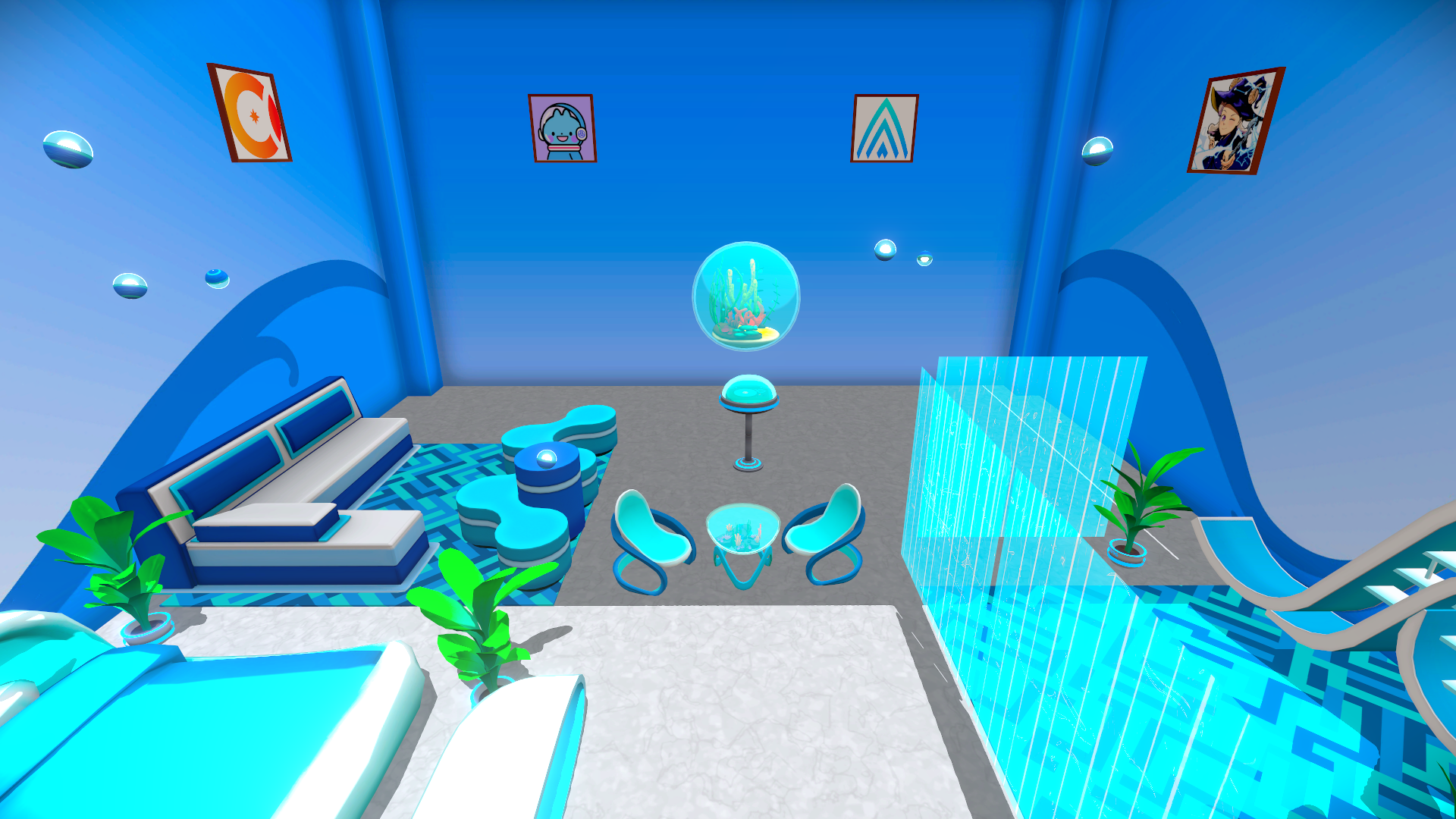 This is a ROOM that has **Hydro-energy components** as the basic material. The hydro room has furniture in bright blue-white colors.